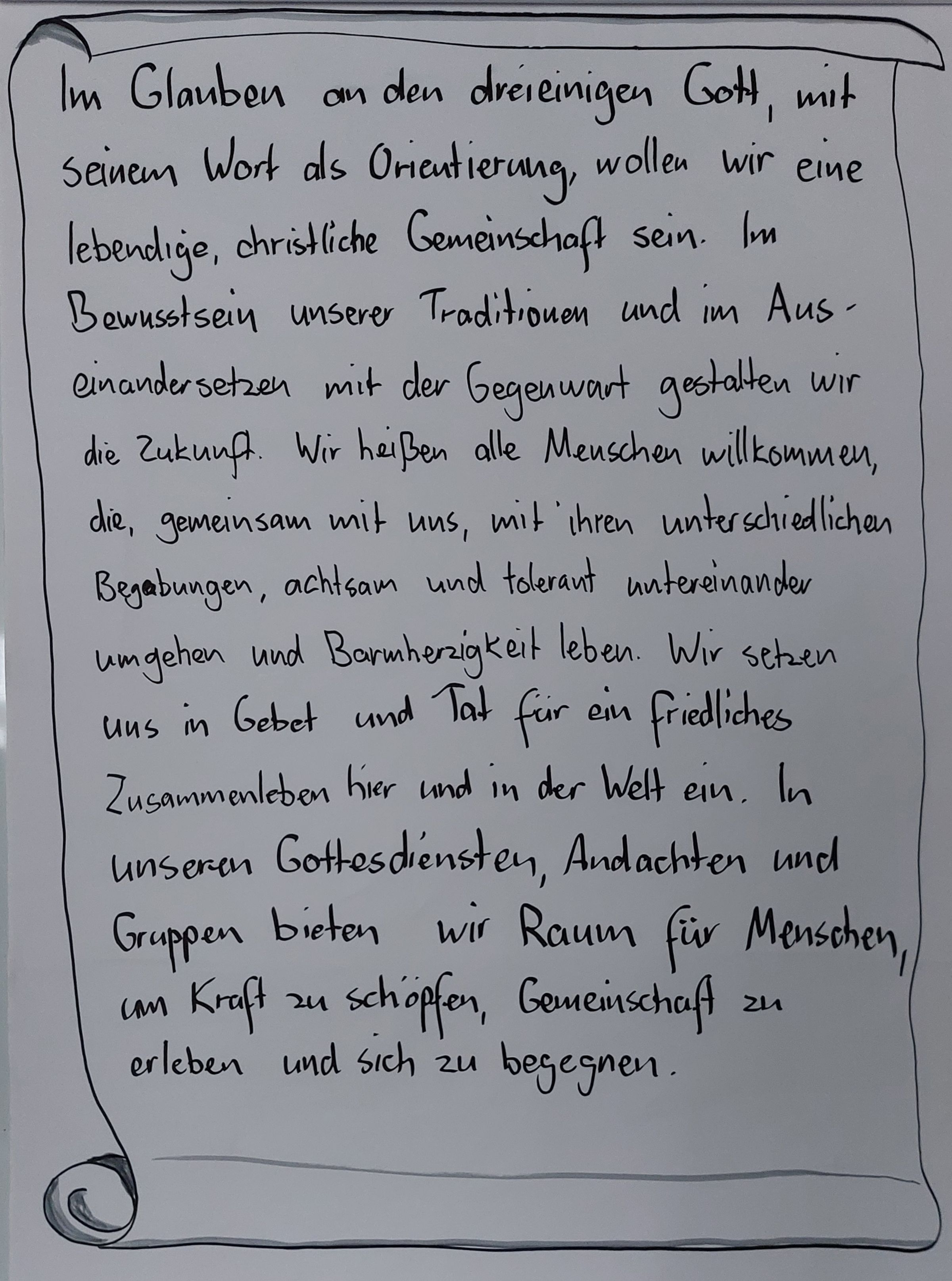 Der Kirchengemeinderat hat auf seiner Klausurtagung im November 2023 das oben zu sehende Leitbild beraten. Es soll uns als Gemeinde eine Orientierung für unser Handeln sein.