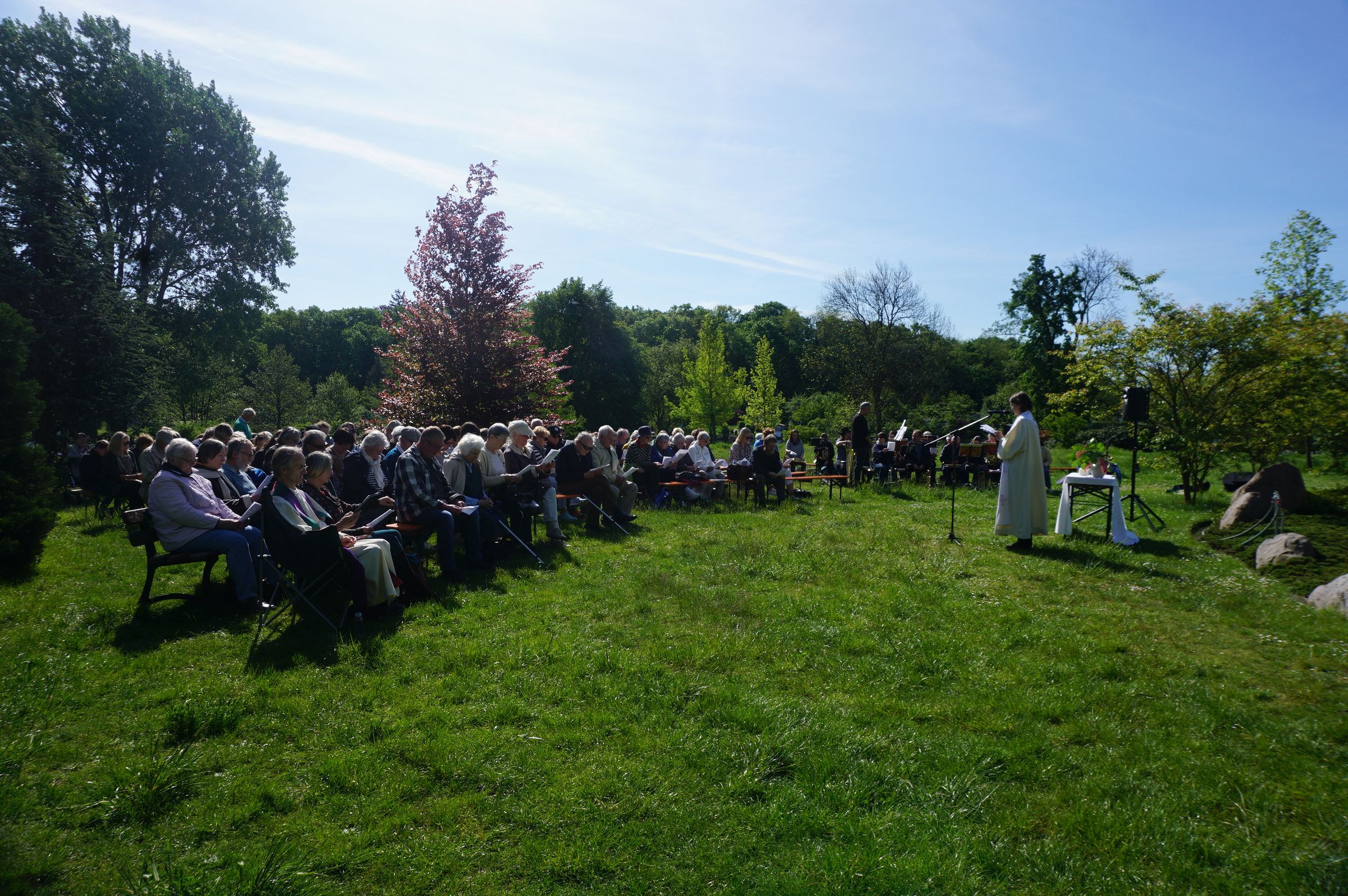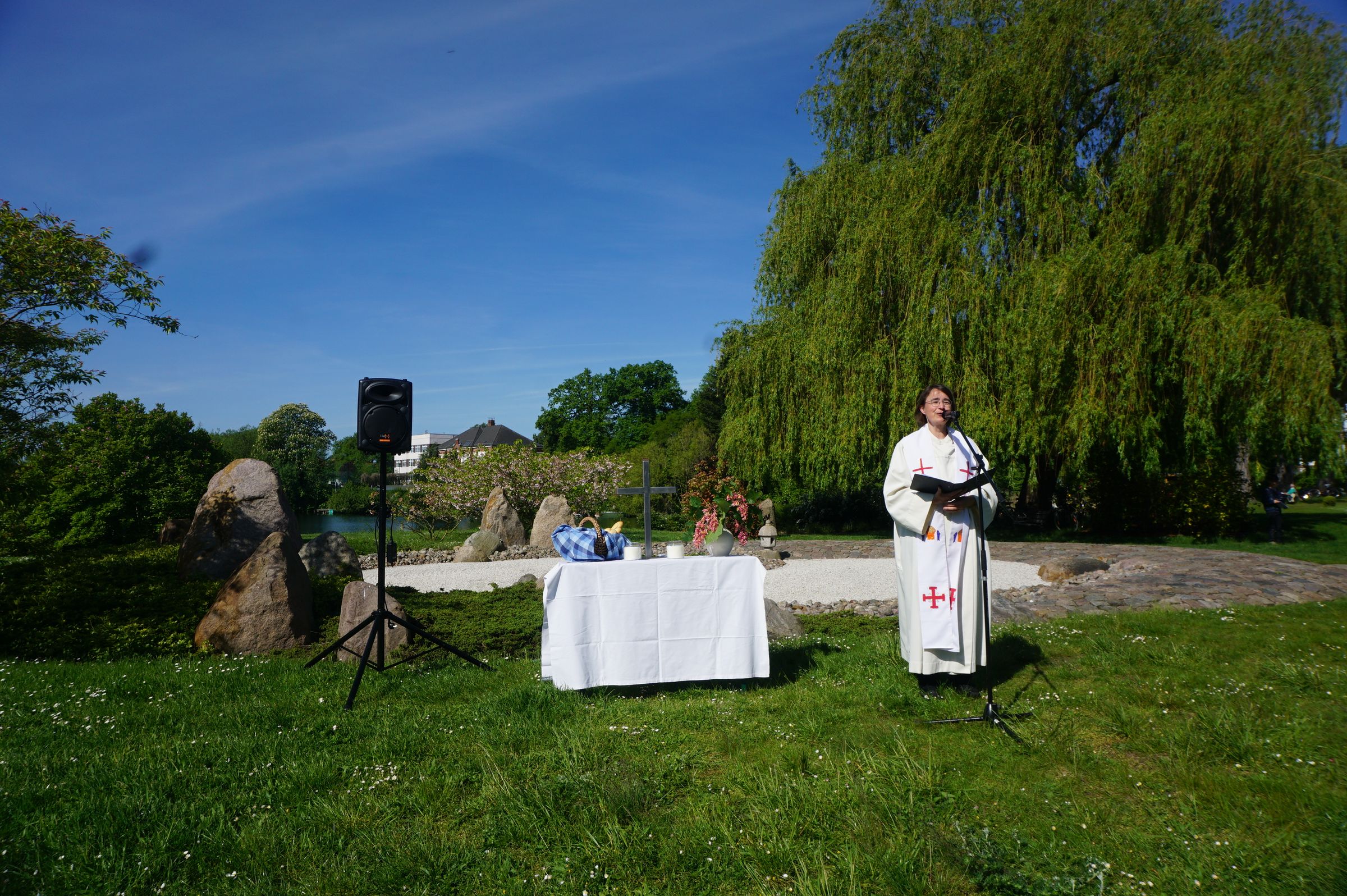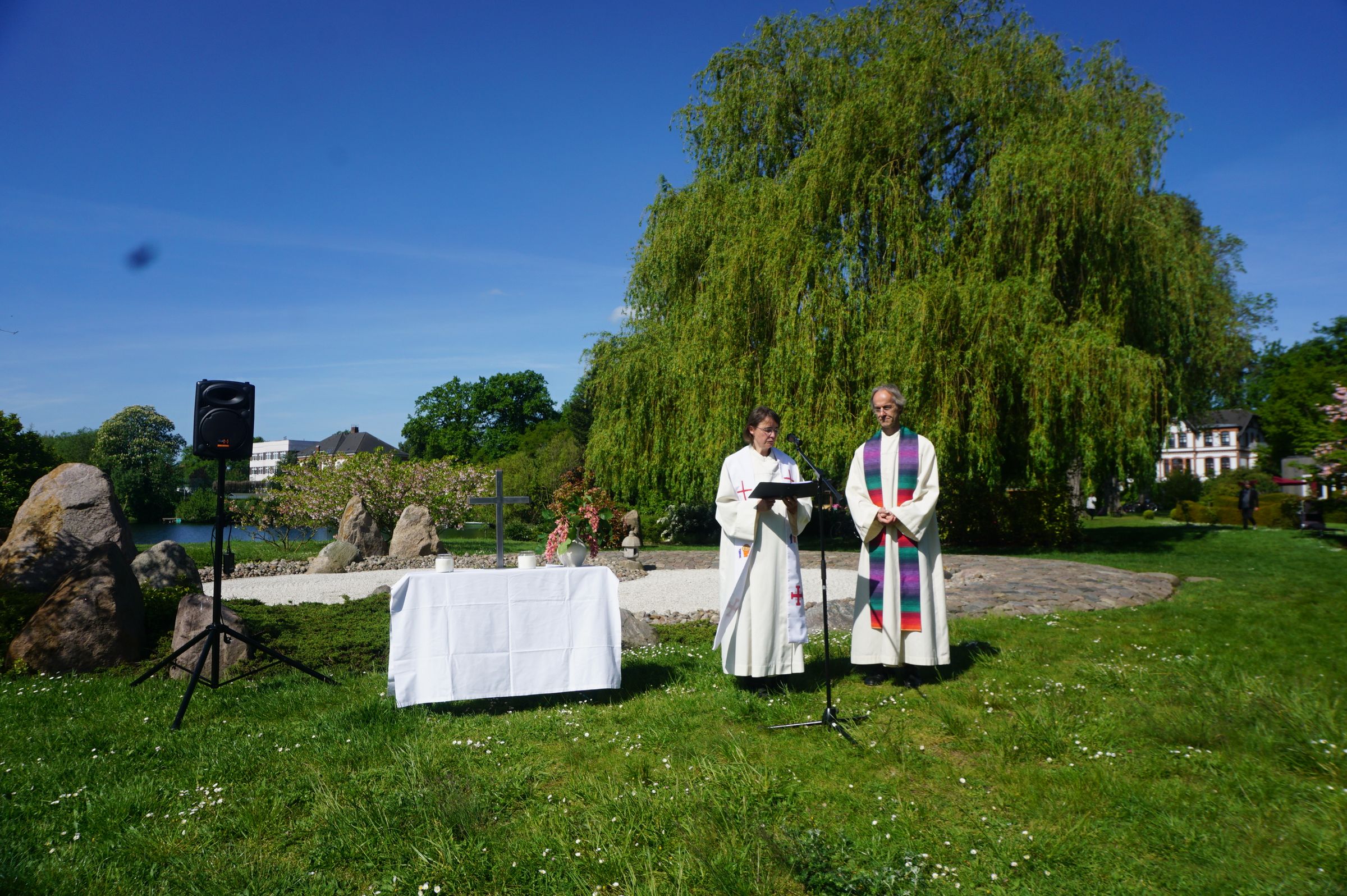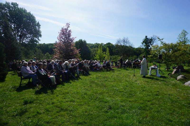 Im Schaugarten des Lebenshilfswerks am Tiefwarensee gestalteten Pastor Marcus Wenzel und Pastorin Anja Lünert gemeinsam diesen Gottesdienst. In dem wunderschönen Ambiente direkt am Ufer des Tiefwarensees wurde bei herrlichstem Sonnenschein der Himmelfahrt Christi gedacht. „Alles schien vorbei, als man Jesus ans Kreuz geschlagen hatte. Aber der Tod hat ihn nicht auslöschen können“, erläuterte Marcus Wenzel in seiner Predigt. Denn er ist wiedergekommen, um den Menschen Hoffnung zu machen. Und dann ist er doch wieder gegangen? Wie soll es weitergehen? Die Frage kennen wohl alle. Die „gute Geistkraft Gottes“ hilft, nannte es der Pastor. Denn wir Menschen sollen nicht unmündig immer Anweisungen einer führenden Person folgen, sondern selbst in Liebe und Glauben tätig werden.