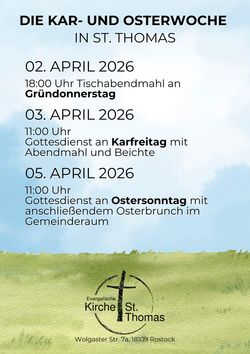 VeranstaltungGottesdienst mit Abendmahl am Karfreitag 03.04.2026 · 11:00 Uhr · 12:00 Uhr Kirche St. ThomasWolgaster Straße 7a18109 Rostock Im Kalender speichern (.ics) Route berechnen zurück zur Übersicht der Veranstaltungen StartseiteGottesdienste und VeranstaltungenGemeindelebenKinder und JugendKirchenmusikGemeindebriefeUnsere StandorteKirche St. ThomasKontakt und MitarbeitendeAnmelden