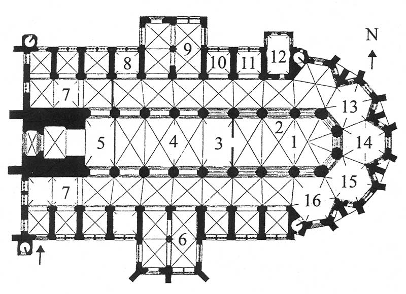 15. Der Steinsarkophag der Johanna von Friesen (18. Jh.) Das Kreuzigungsretabel um 1500 stammt aus St. Georgen Wismar. 16. Gotisches Gestühl aus St. Georgen ist im Chorumgang aufgestellt.