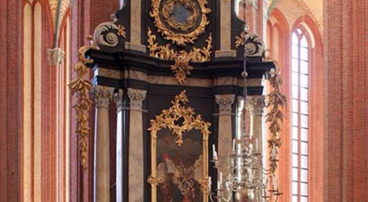 10. Bronzene Grabplatte der Herzogin Sophie von Mecklenburg (=1504) Der Marienschrein (15.Jh.) weist in seiner Malerei Szenen aus dem Marienleben auf. Die Festtagsseite zeigt die Mondsichelmadonna und sechs weibliche Heilige. Der Thomasaltar (um 1500) stammt wie auch der Marienschrein und die bronzene Grabplatte aus dem Dominikanerkloster. Dargestellt werden (von links) der Apostel Thomas, Thomas von Aquin und Thomas Becket (Erzbischof von Canterbury). In den Flügeln und in der Predella sind Szenen aus dem Leben und Sterben des Thomas von Aquin zu sehen. Im Gewölbe dieser Kapelle ist eine mittelalterliche Darstellung einer Hansekogge zu entdecken.