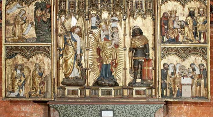 13. Der Krämeraltar (Mitte 15. Jh.) stammt aus der St. Marienkirche. Links neben der Mondsichelmadonna kämpft der Erzengel Michael mit dem Drachen rechts ist Mauritius, der Schutzpatron der Krämer zu sehen. In den Flügeln werden Szenen aus der Weihnachtsgeschichte gezeigt. Die „Heiligen Drei Könige“ sind in drei Lebensaltern dargestellt: Jung und Alt können Jesus begegnen. Die drei damals bekannten Kontinente Europa, Afrika und Asien sind durch drei Nationalitäten vertreten: Die ganze Welt wird Jesus sehen. Die Körperhaltung der Könige verrät unterschiedliche Glaubenshaltungen: Der eine hat Jesus als den König erkannt und kniet nieder. Der andere krault fragend seinen Bart: Kann das der große König sein? Der dritte hat wohl den König nicht erkannt: er wendet sich ab. Der Jesusknabe im Mittelschrein spielt auf einem flötenartigen Instrument.