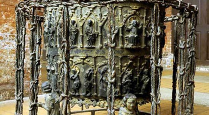 11. Barlach und Marcks – Die zwei Terrakottafiguren von Ernst Barlach (1870-1938) „Der Wanderer“ und „Die Erwartende“ in St. Nikolai sind 1927 als Modelle für den „Fries der Lauschenden” entstanden. Später im Jahre 1935 schreibt er über sein Werk: „Nun, immerhin ist der Fries aus 9 Figuren in Holz für Reemtsma fertig geworden, gut oder schlecht, es wird sich wohl erweisen, wenn das Auslegen nach parteilicher Weltanschauung aus der Mode gekommen ist, wenn die Dinge einmal nicht mehr massen-menschlich gesehen werden.“ Die Skulpturen von Gerhard Marcks (1889-1981) bestehen aus dem Posaune blasenden Engel (1919) und aus sechs Terrakottamodellen für die ‚Gemeinschaft der Heiligen‘ an St. Katharinen zu Lübeck (1949): (Von links nach rechts) Schmerzensmann, Frau mit Kind, Kassandra, Jungfrau, Prophet, Brandstifter. Die bronzene Tauffünte (1335) Die Taufe stammt aus der Marienkirche. Dargestellt sind Szenen aus dem Leben Jesu und das Gleichnis klugen und törichten Jungfrauen. Das kunstvoll geschmiedete Gitter ist etwa einhundert Jahre später dazu gekommen. Nach dem Volksglauben sollte das Gitter ‚böse Mächte‘ vom Taufwasser fernhalten. Der Schifferaltar ist der einzige von 38 Altären, der der Nikolaikirche erhalten blieb. In der Mitte werden Jakobus der Ältere, Maria, Bischof Nikolaus und in den Flügeln je vier Heilige gezeigt. Gegenüber befindet sich der Schrein der Tausend Märtyrer (ehemals Dominikanerkloster)