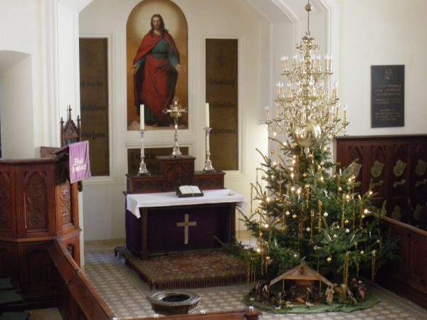 In einer groß angelegten Renovierung wurde 1875 besonders der Innenraum neogotisch umgestaltet. Die Stuckdecke wurde eingezogen und Gestühl, Empore, Kanzel und Altar erneuert. In einem Rundbogen hinter dem Altar befindet sich seitdem ein Gemälde, das den Segnenden Christus zeigt. Die Fenster im Kirchenschiff wurden verkleinert und in Glasmalerei mit Dekor und den Wappen der Patronsfamilie ausgeführt.