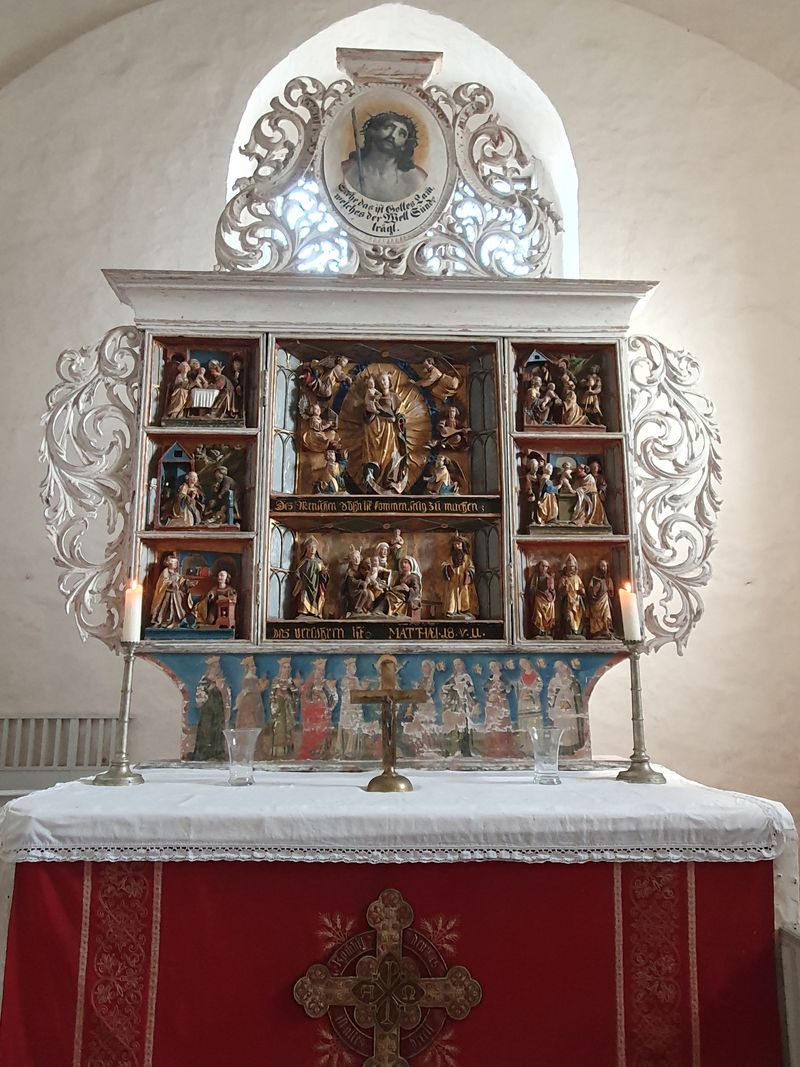 Der Schnitzaltar vom Anfang des 16. Jahrhunderts gilt als bedeutend. Die Rückwand wird von einem holzgeschnitzten Schrein gebildet, vermutlich gleichzeitig mit der Kanzel entstanden. Im horizontal unterteilten Schrein ist oben eine apokalyptische Madonna als Himmelskönigin mit Engeln auf Strahlenhintergrund zu sehen. Die niedrigere untere Hälfte enthält die Gruppe Anna Selbdritt, rechts der die Harfe spielende König David und links ein Bischof. Fünf der Reliefs in den Flügeln zeigen Szenen aus der Weihnachtsgeschichte, ein verlorenes Relief wurde unten rechts durch ein anderes mit drei Heiligenfiguren ersetzt. Ein bartloser mit einem Buche in der linken Hand, ein vollbärtiger Bischof in großer Amtstracht, in der linken Hand einen Stab führend. Der dritte, barhäuptig, vollbärtig, liest schreitend in einem Buch, das er in der rechten Hand trägt. Wahrscheinlich gehörten diese drei Heiligen nicht zur ursprünglichen Anlage. Das Gemälde in der Predella zeigt die fünf klugen und die fünf törichten Jungfrauen. Die Umrahmung dieses Schreins wie der obere Aufsatz stammen aus dem Anfang des 18. Jahrhunderts.