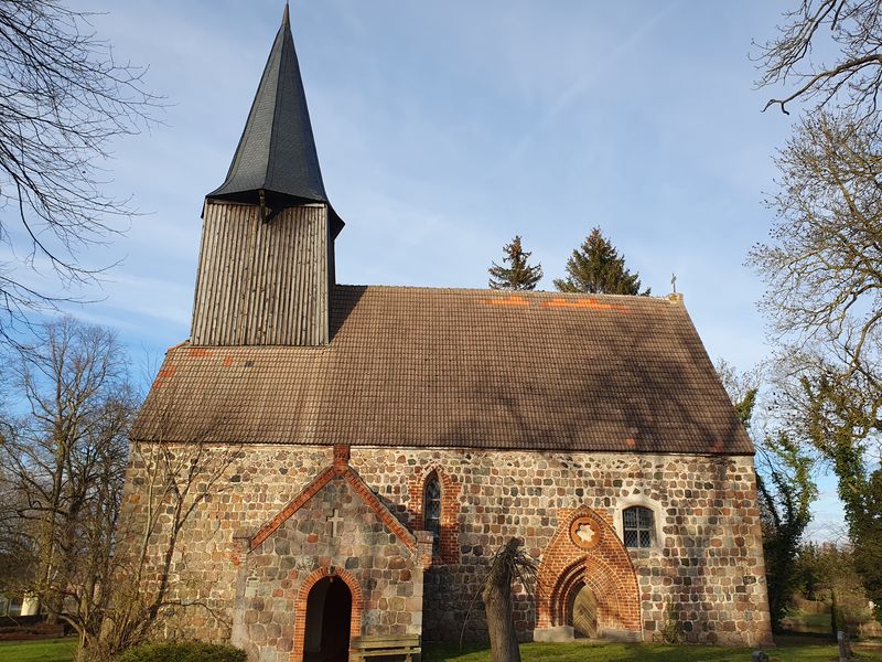 Der frühgotische Feldsteinbau wurde in der zweiten Hälfte des 13. Jahrhunderts errichtet, der hölzerne Turmaufsatz Mitte des 16. Jahrhunderts. Das Dachwerk des Schiffs wurde 1581 erneuert. Für die an der nördlichen Westseite im 15. Jahrhundert angebaute Gerberkammer entstand im 18. Jahrhundert der Gruftanbau aus Feldsteinen und mit einem Mansarddach.