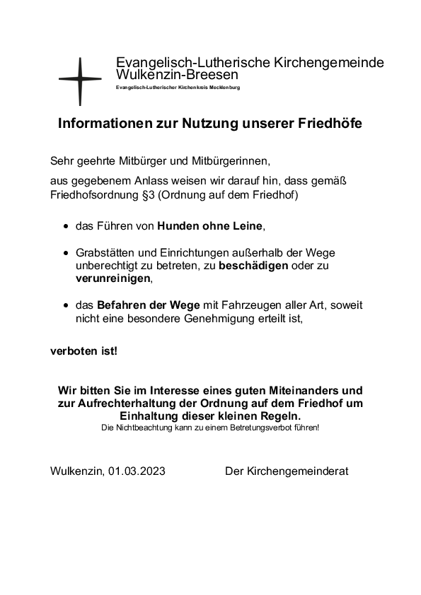 Der Kirchengemeinderat der Ev.-Luth. Kirchengemeinde Wulkenzin-Breesen hat am 05.03.2024 eine Friedhofs- und Friedhofsgebührenordnung beschlossen.