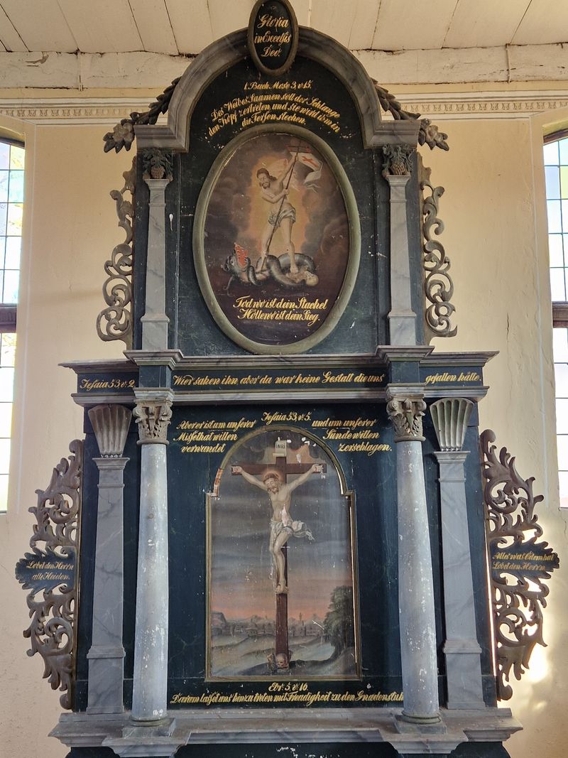 Auf dem Altar hier in Woggersin hat der Maler uns das Geschehen und die Bedeutung von Karfreitag und Ostern vor Augen gemalt.