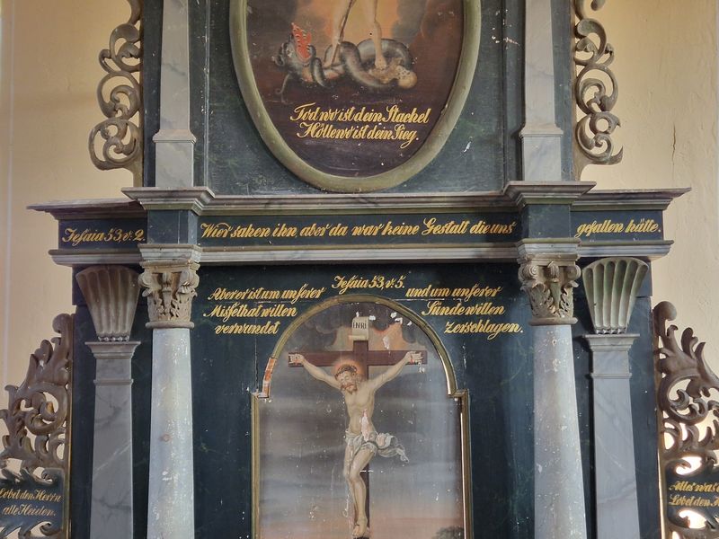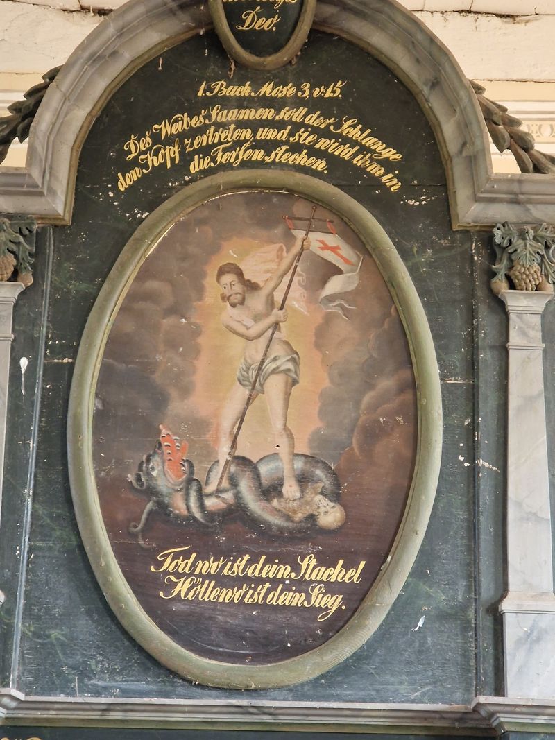 Ob dem Maler und den Bauherren damals nicht aufgefallen ist, dass sich hier ein Schreibfehler eingeschlichen hat? (Hier steht Hebräer 5, 16. Das 5. Kapitel hat nur 14 Verse insgesamt und das Zitat ist dem 4. Kapitel entnommen)