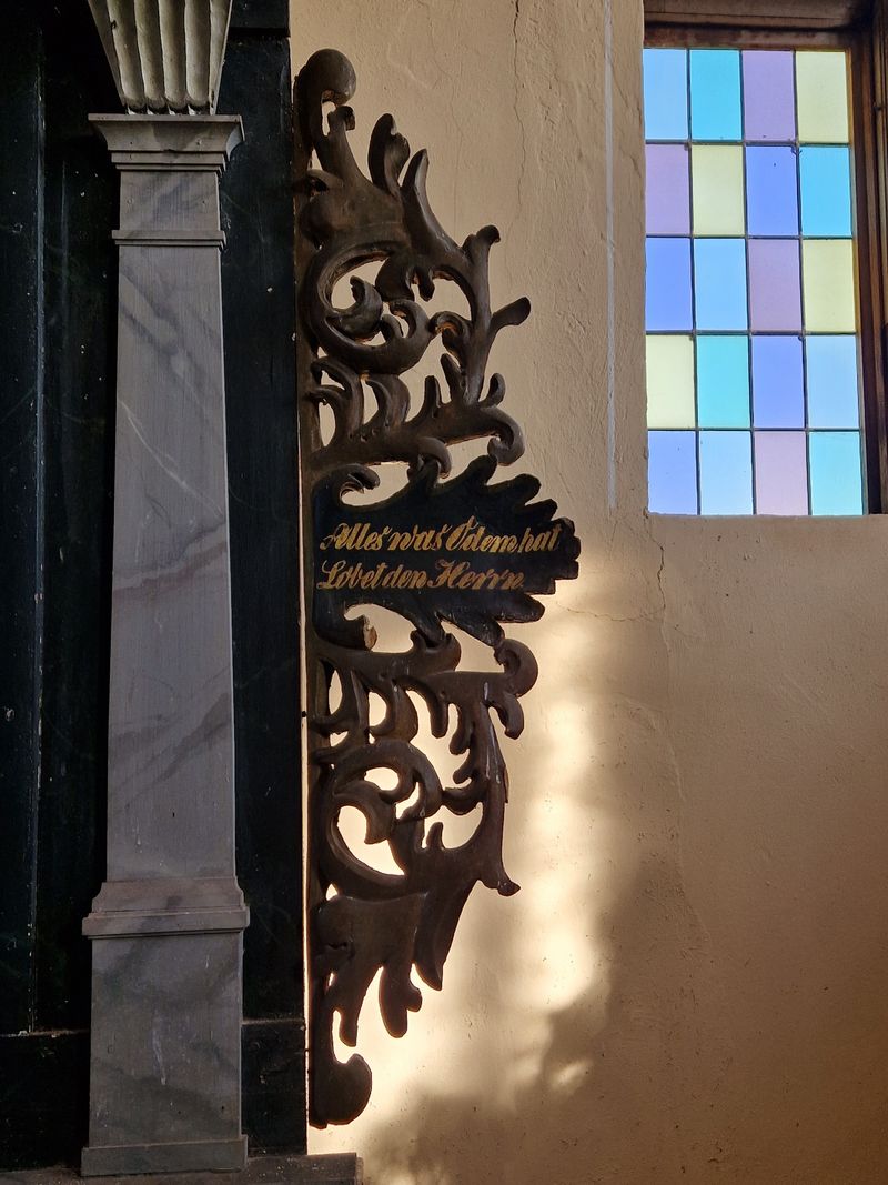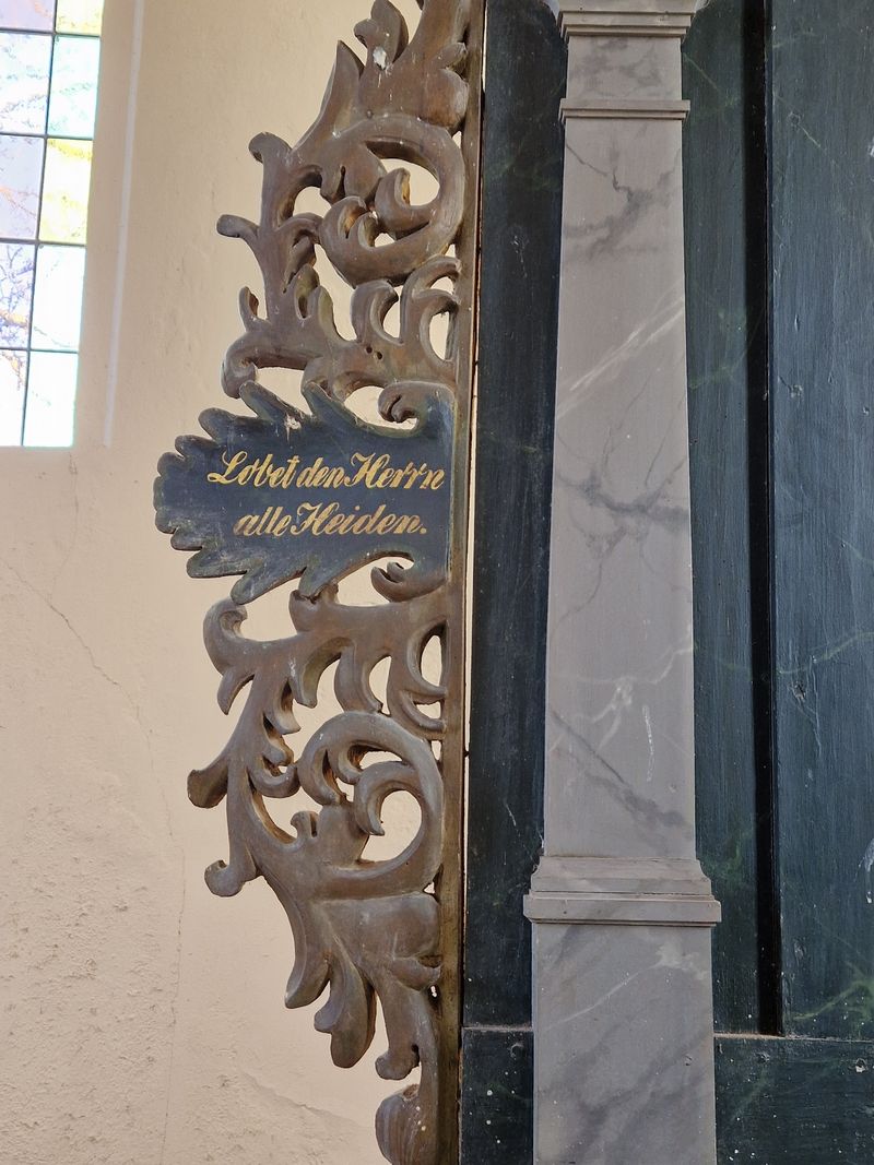 Darum steht ganz folgerichtig auf den Blättern der Seitenranken: „Lobet den Herrn alle Heiden“ und „Alles was Odem hat (alles was lebt) lobet den Herrn“.