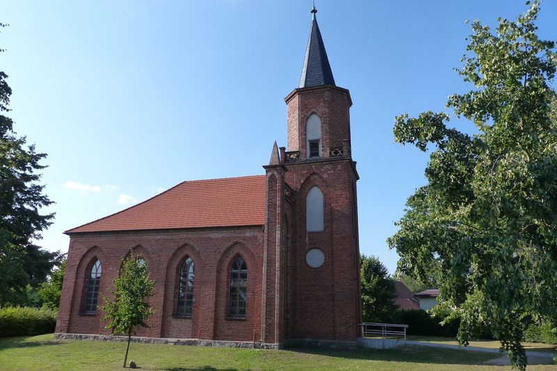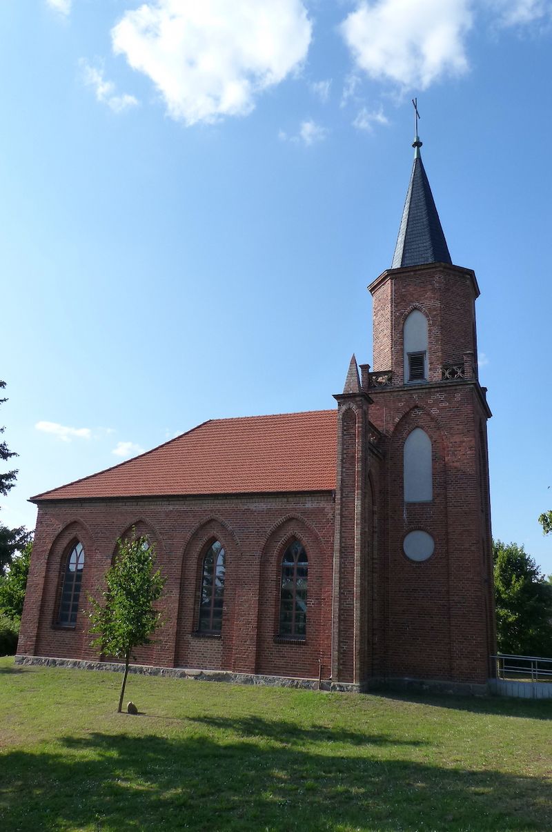 Der rechteckige Backsteinsaal auf einem Feldsteinsockel mit polygonalem Chorschluss und vorgesetztem Turm wurde 1830–31 von Friedrich Wilhelm Buttel, Baurat des Großherzog von Mecklenburg-Strelitz und Schinkel-Schüler, erbaut.